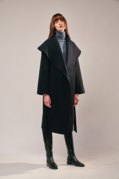 • 노버튼 형식으로 안쪽에 고리단추 여밈이 있는 미니멀한 디자인으로 케이프 카라의 여성스럽고 편안한 실루엣의 코트