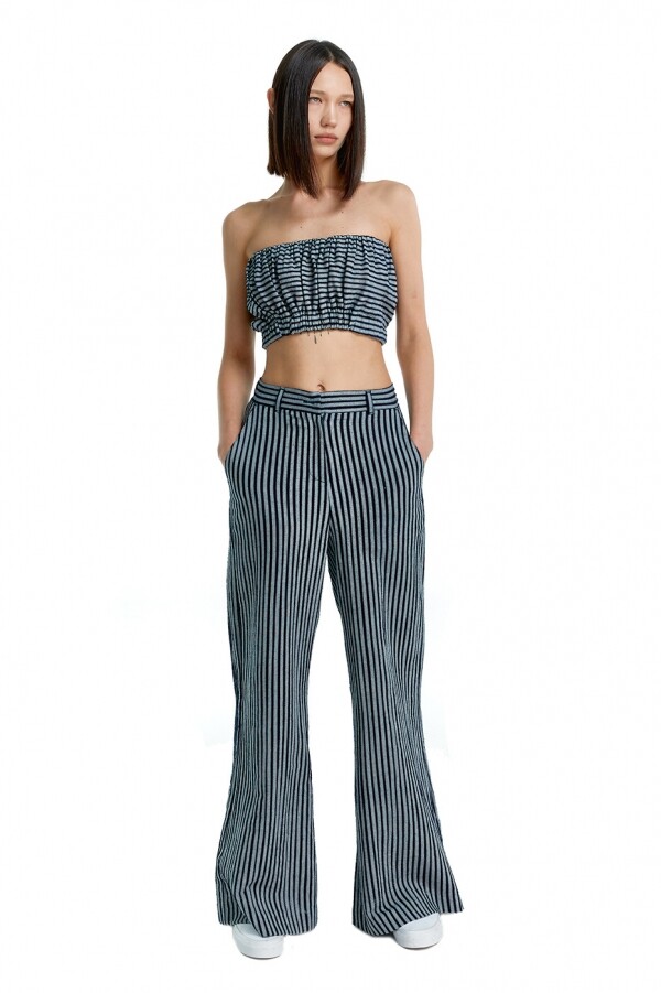 리사이클 수입 원단으로 제작된 부츠컷 데님 팬츠입니다. 다리를 날씬하고 길게 연출하는 긴 기장감의 디자인으로 2PC의 수트 팬츠로 제작된 제품이지만 다양한 아이템과 멋스러운 스타일을 연출할 수 있는 제품입니다.