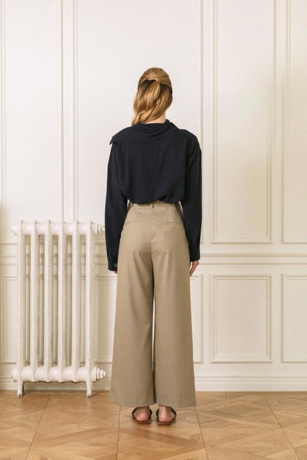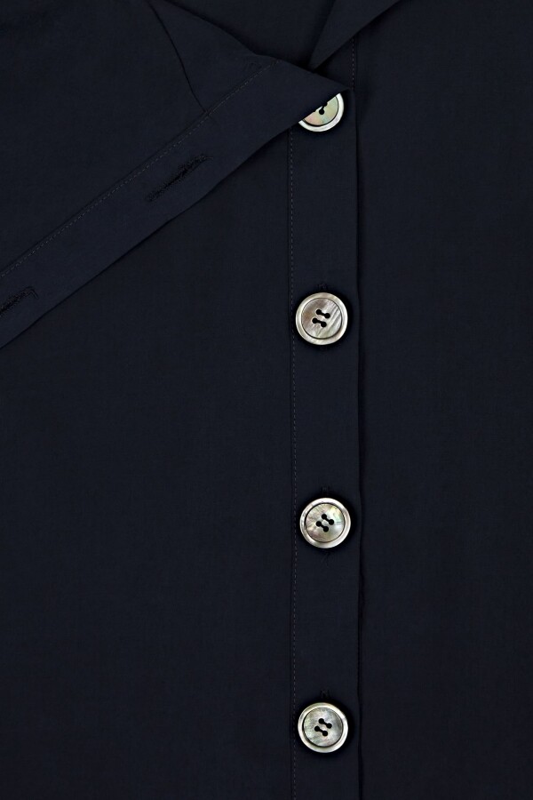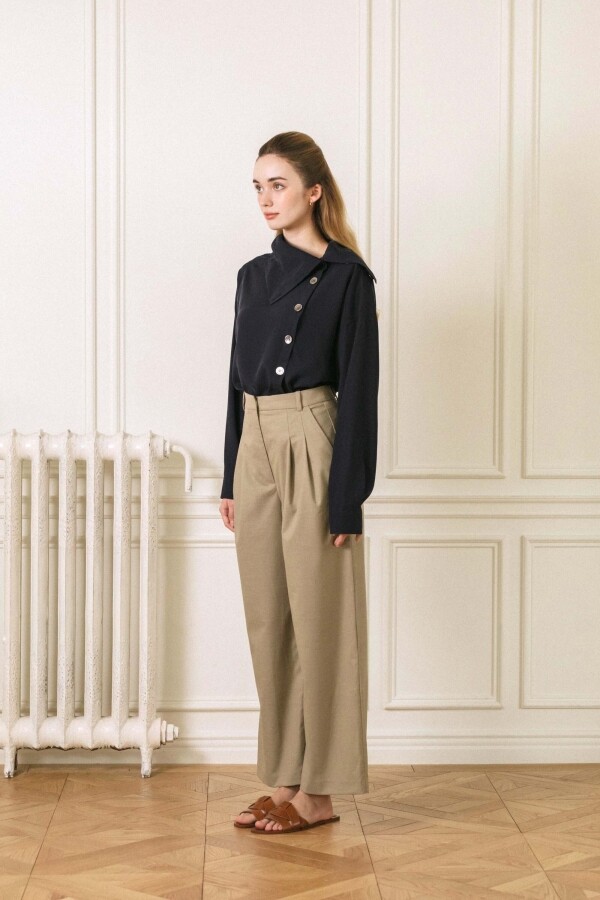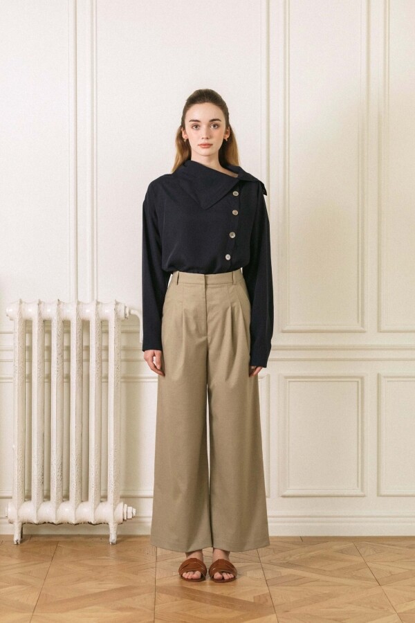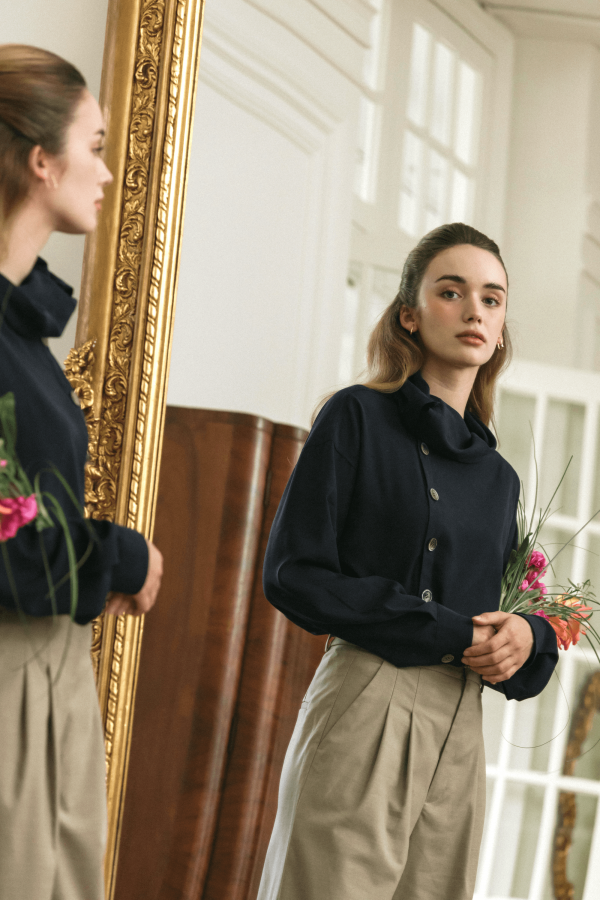 빛에 따라 여러 색깔을 나타내는 천연 자개 단추를 포인트로 한 투웨이 블라우스입니다. 단추를 끝까지 채워 하이넥으로 연출 할 수 있고, 카라를 늘어뜨리는 형식으로도 연출 가능합니다. 일본 프리미엄 원단사인 STYLEM사의 CUPRO 100%로 구성된 지속가능한 원단을 사용하였습니다. 고급스러운 광택감과 드레이프성이 뛰어난 원단으로, 우아한 실루엣을 담았습니다.