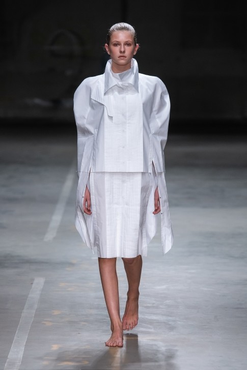 사각형의 면을 접기 방식만으로 디자인한 제품으로 커팅 라인이 없는 소매와 바디라인이 특징인 드레스