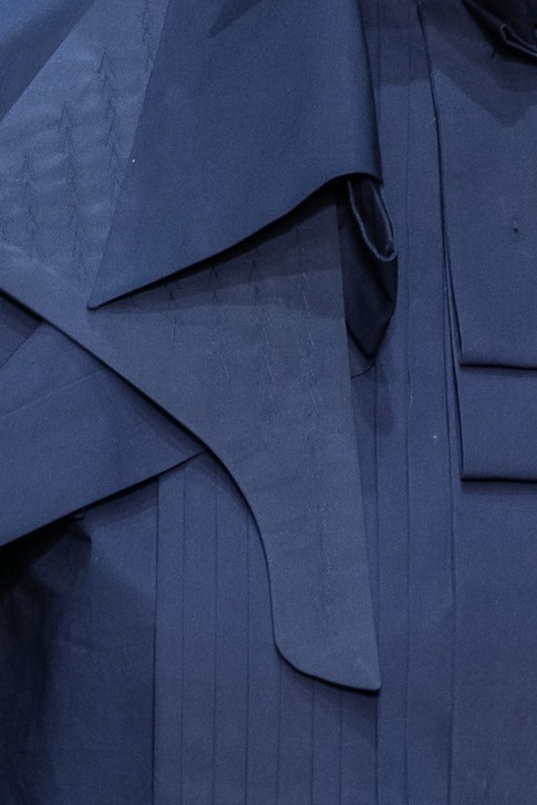 사각형의 면을 접기 방식만으로 디자인한 제품으로 커팅 라인이 없는 소매와 바디라인이 특징인 드레스