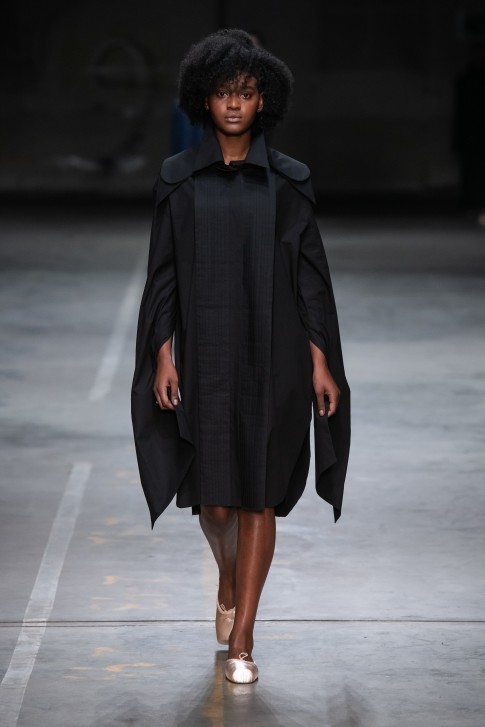 사각형의 면을 접기 방식만으로 디자인한 제품으로 커팅 라인이 없는 소매와 바디라인이 특징인 드레스
