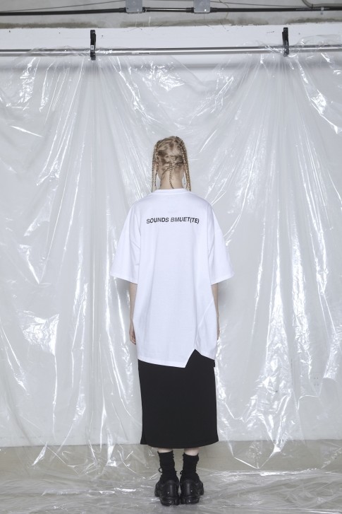 비대칭한 기장과 독특한 방식의 절개 스타일의 티셔츠로 아티스트 Claudette Schreuders와의 콜라보레이션 제품