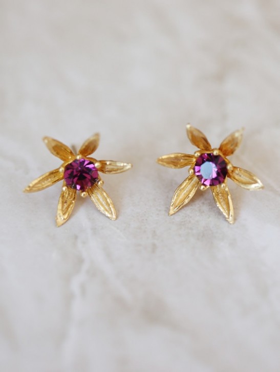 • 황동 소재에 진한 24k 골드가 도금 된 꽃받침에 버건디 컬러의 스와로브스키 크리스탈이 세팅되어 있는 꽃 귀걸이