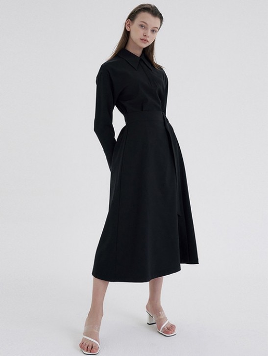 • 허리 라인이 스트랩되는 랩 형식의 드레스 입니다. 셔츠 슬리브와 재원단의 단추가 군더더기 없이 포멀한 무드