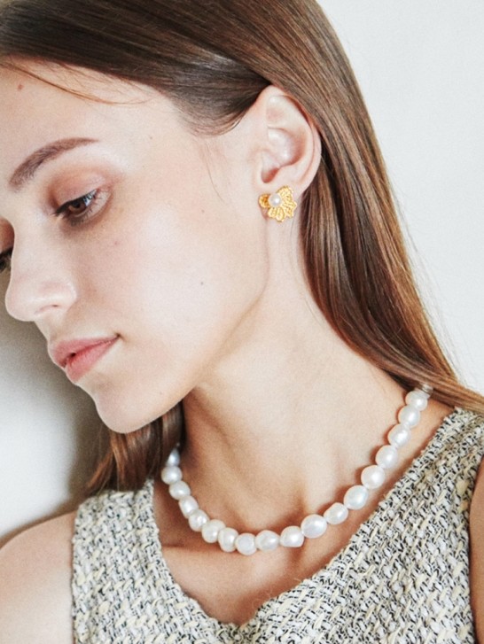 • 굵은 11mm 진주들이 꿰어지고 꽃으로 마무리 장식이 된 화려한 무드의 진주 목걸이
