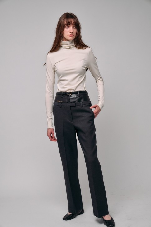• 유연한 느낌의 울 혼방 수입 소재를 사용하였으며, 허리 디테일에 다른 소재로 레이어링한 이중오비 디자인으로 포인트를 준 팬츠