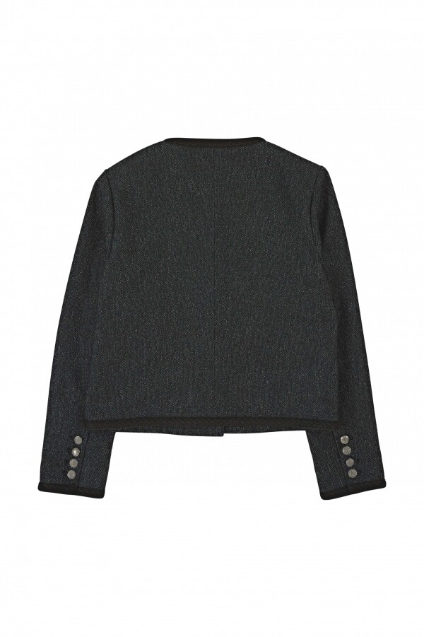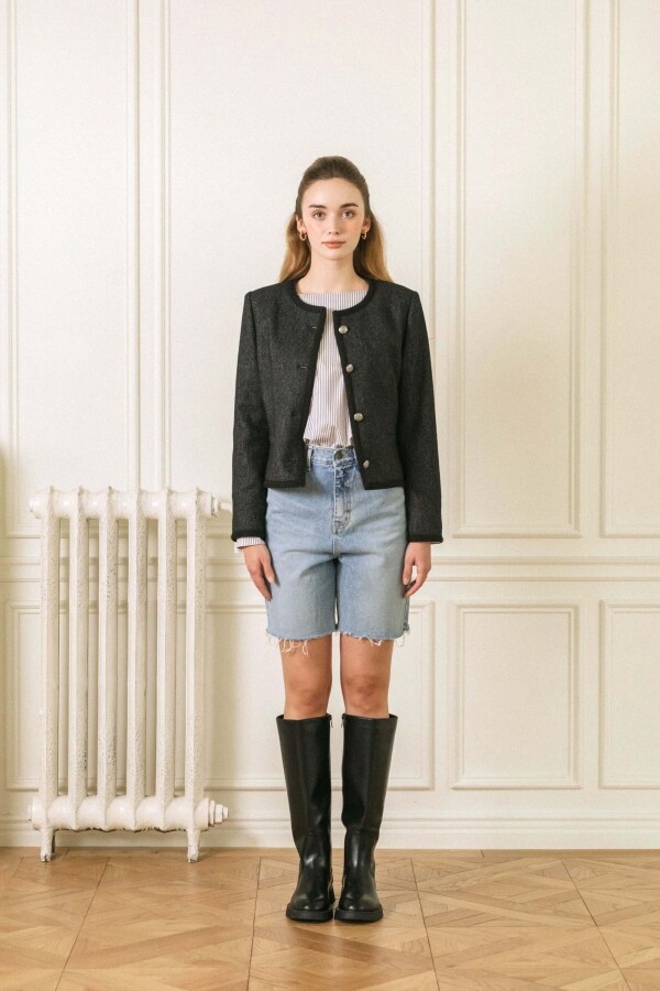 세련되면서도 절제된 테일러링이 특징인 스트라이프 자켓입니다. 최상의 일본 TAKISADA NAGOYA의 리사이클 울이 함유된 소재를 사용하여, 국내에서는 보기 힘든 고급스러운 스트라이프 원단입니다. 프리미엄 소가죽으로 만든 단추를 사용하여, 클래식하면서도 고급스러운 분위기를 살렸습니다. 모던하고 클래식한 실루엣으로, 유행을 타지 않고 오래 입을 수 있는 아이템입니다.힙 위로 올라오는 크롭기장으로, 일상생활에서 다양한 코디를 연출하기 쉬운 제품입니다.