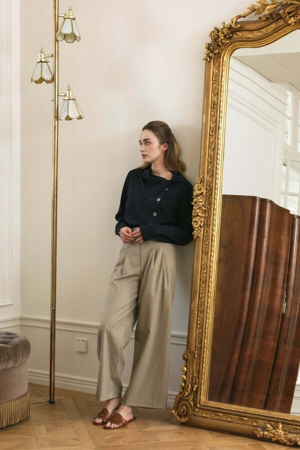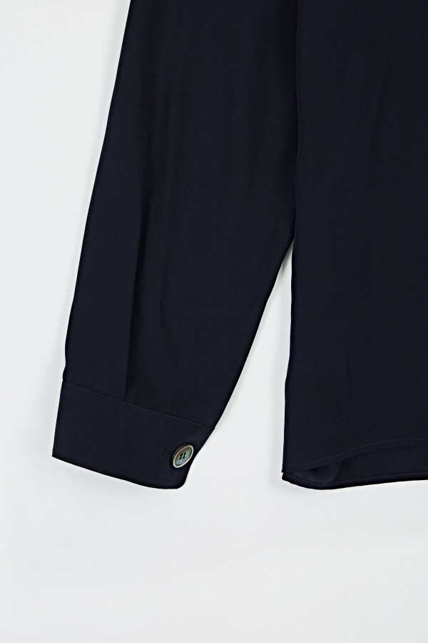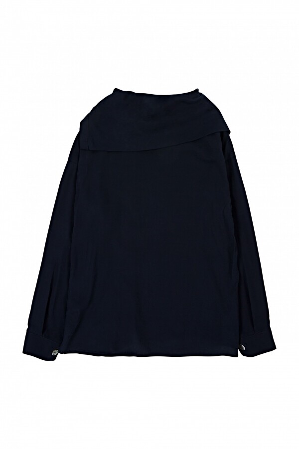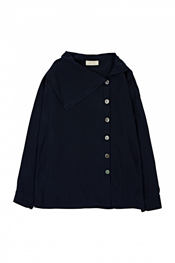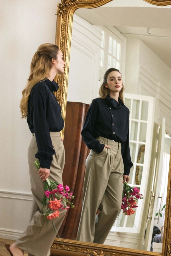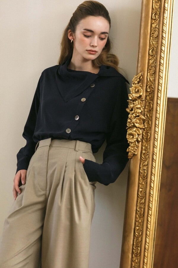 빛에 따라 여러 색깔을 나타내는 천연 자개 단추를 포인트로 한 투웨이 블라우스입니다. 단추를 끝까지 채워 하이넥으로 연출 할 수 있고, 카라를 늘어뜨리는 형식으로도 연출 가능합니다. 일본 프리미엄 원단사인 STYLEM사의 CUPRO 100%로 구성된 지속가능한 원단을 사용하였습니다. 고급스러운 광택감과 드레이프성이 뛰어난 원단으로, 우아한 실루엣을 담았습니다.