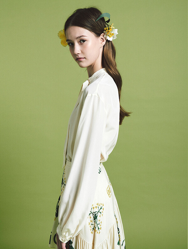 • 얇은 타이와 퍼프 소매로 완성시키는 페미닌한 분위기의 블라우스