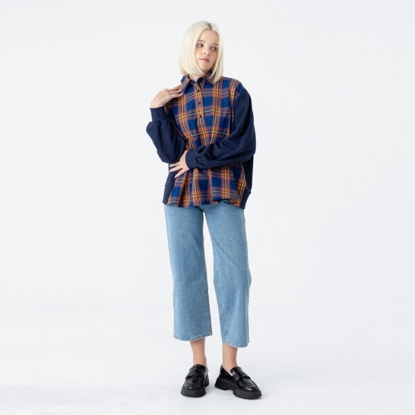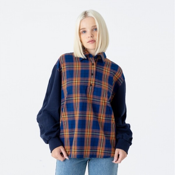 • 분더가이스트 체크배색 벌룬슬리브 스웨트셔츠 네이비 WUNDERGEIST