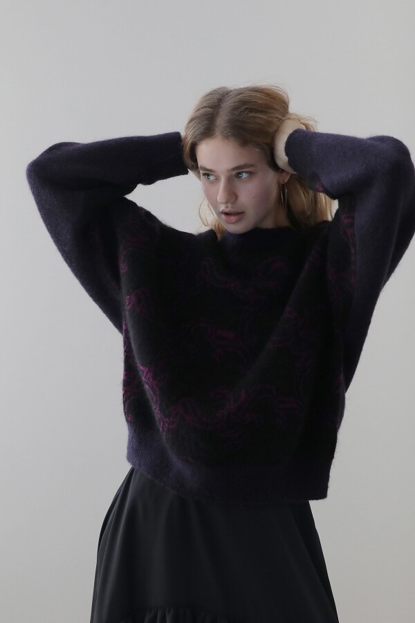 블랙&퍼플 컬러의 자카드 니트 넥라인 양쪽 사이드 슬릿 포인트 루즈핏의 드롭 어깨 라인 프론트 투톤 자카드 패턴 부드럽고 포근한 모헤어 소재