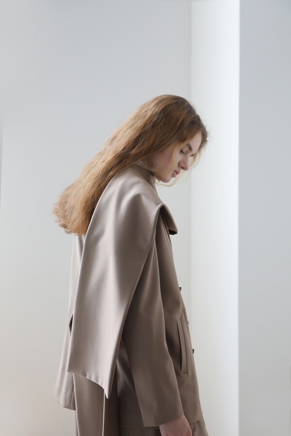 라이트 그린 컬러의 실크 자켓 암홀 아래 컷아웃 된 부분에 팔을 넣어 착용하는 케이프 디자인 고급스러운 광택감의 실크 소재 크롭 기장으로 롱레그라인 연출