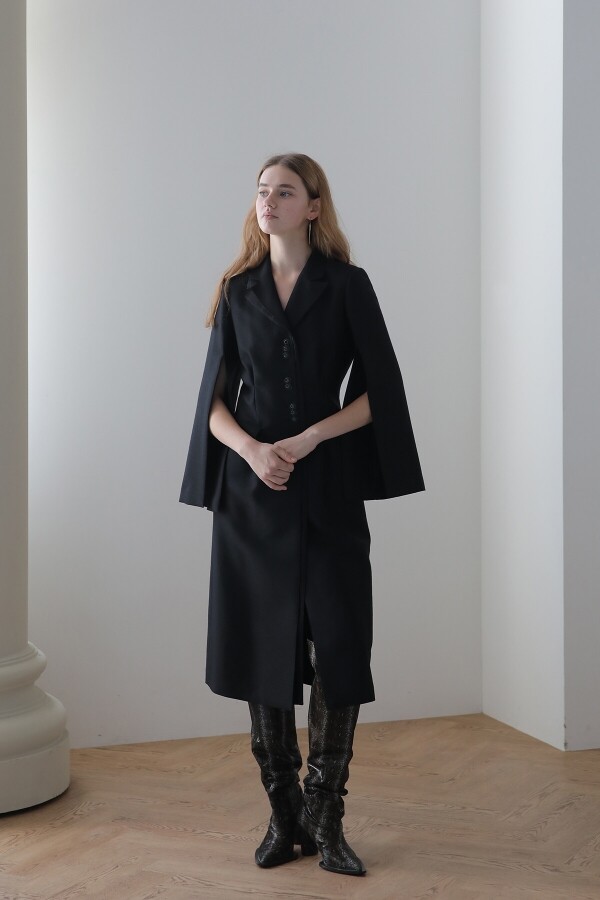 블랙 컬러의 케이프 롱 코트 부드럽고 가벼운 울&캐시미어 혼방 소재 퍼플 컬러의 파이핑과 단추 포인트