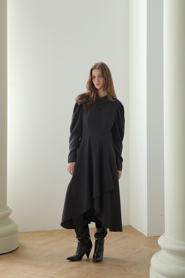 블랙 컬러의 케이프 원피스 미니멀한 케이프 디자인 탄탄한 조직감의 실크 소재 웨이스트 비즈 포인트 언밸런스 스커트 디자인
