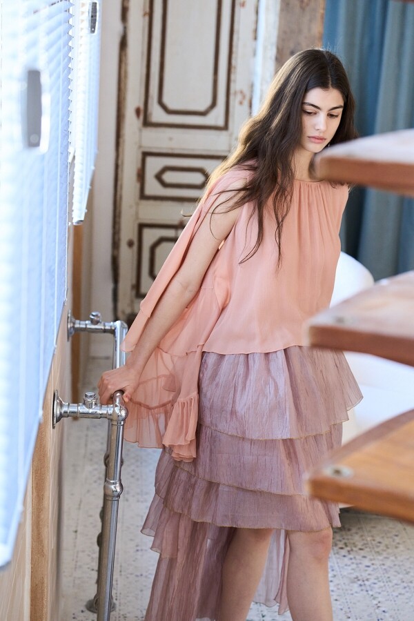 • 아프리콧 컬러의 실크 블라우스 암홀 아래 컷아웃 된 부분에 팔을 넣어 착용하는 케이프 디자인 두겹으로 제작되어 비침없음 루즈핏 실루엣으로 편한 착장감
