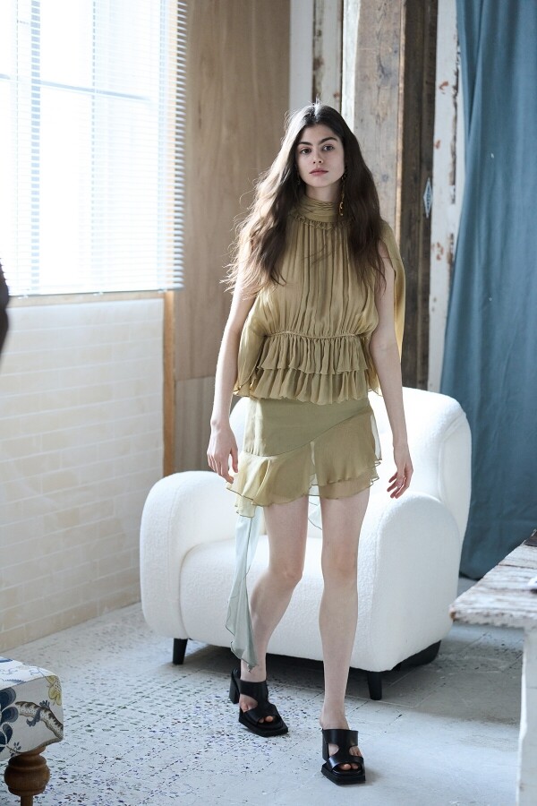 아이보리 컬러의 러플 블라우스 어깨부터 프론트까지 이어진 볼륨감 있는 러플 디테일 잔잔한 스트라이프의 면과 실크 혼방 소재