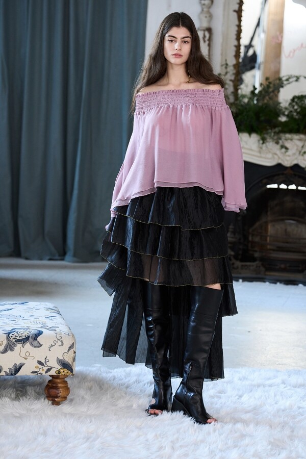 블랙 컬러의 프릴 블라우스 여러 겹의 화려한 플레어 소매 포인트 네크라인과 앞여밈 프릴 디테일로 풍성한 볼륨감 고급스러움을 더해주는 실크 소재 루즈핏으로 편한 착장감