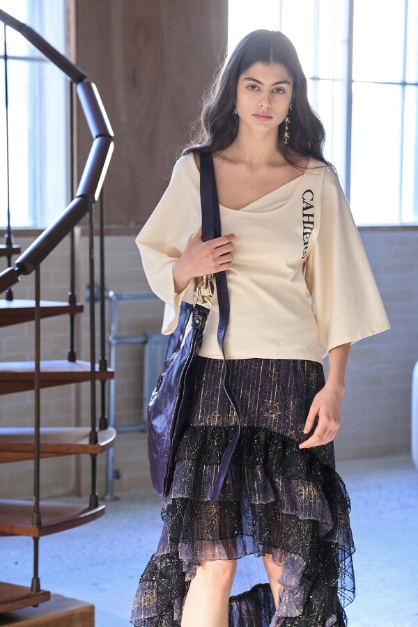 • 아이보리 컬러의 U넥 티셔츠 언밸런스한 숄더로 2벌의 티셔츠를 겹쳐 입은 듯한 레이어드 디자인 웨이스트 컷아웃 디테일 왼쪽 암홀 라인의 까이에 로고 포인트