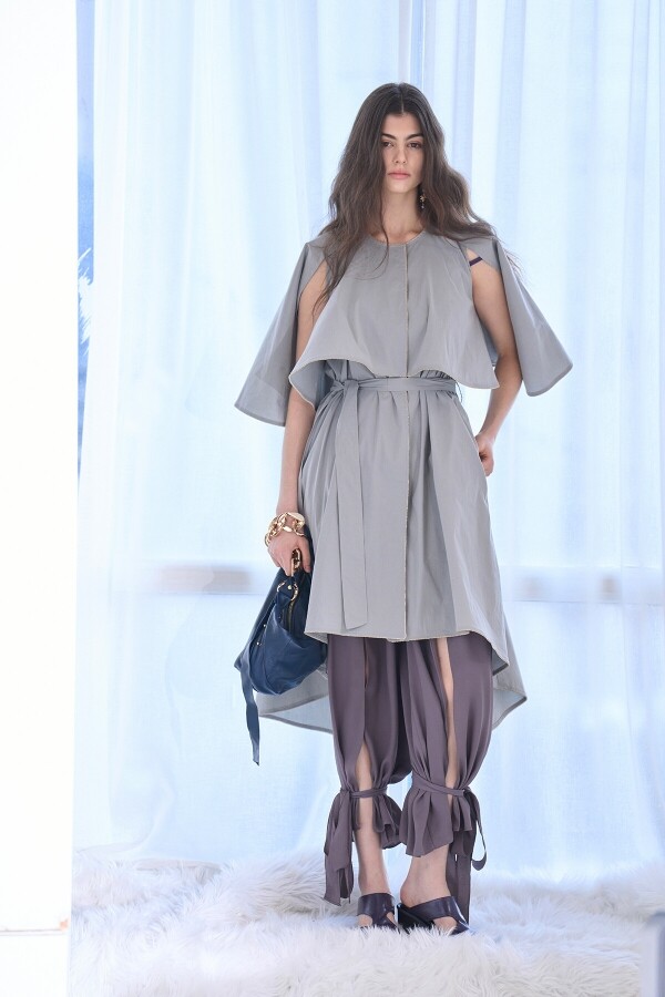 • 그레이 컬러의 리본 팬츠 앞 중심 절개 포인트 밑단 타이를 리본으로 묶어 볼륨감 있는 핏으로 연출 가능 촤르르 떨어지는 소재로 걸을 때마다 화려한 무브먼트를 선사