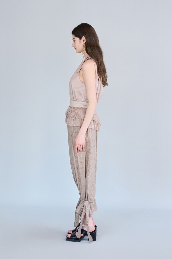 • 베이지 컬러의 리본 팬츠 앞 중심 절개 포인트 밑단 타이를 리본으로 묶어 볼륨감 있는 핏으로 연출 가능 골드 트리밍 된 홀 디테일의 유니크한 원단 사용