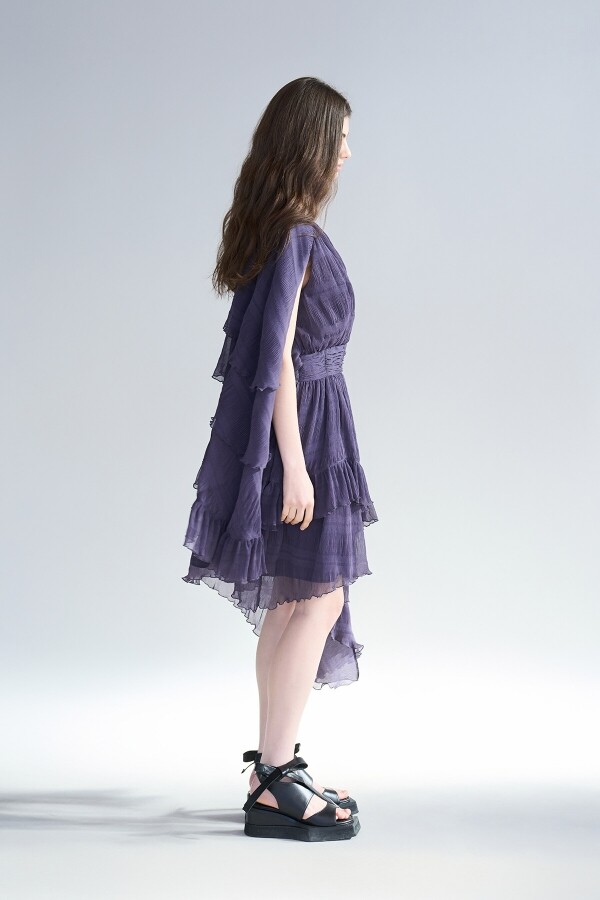 • 다크 그레이 컬러의 티어드 원피스 암홀 아래 컷아웃 된 부분에 팔을 넣어 착용하는 케이프 디자인 랩스타일 디자인 언밸런스 기장의 티어드 디자인