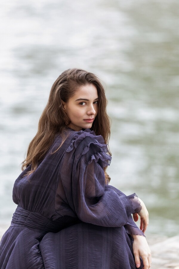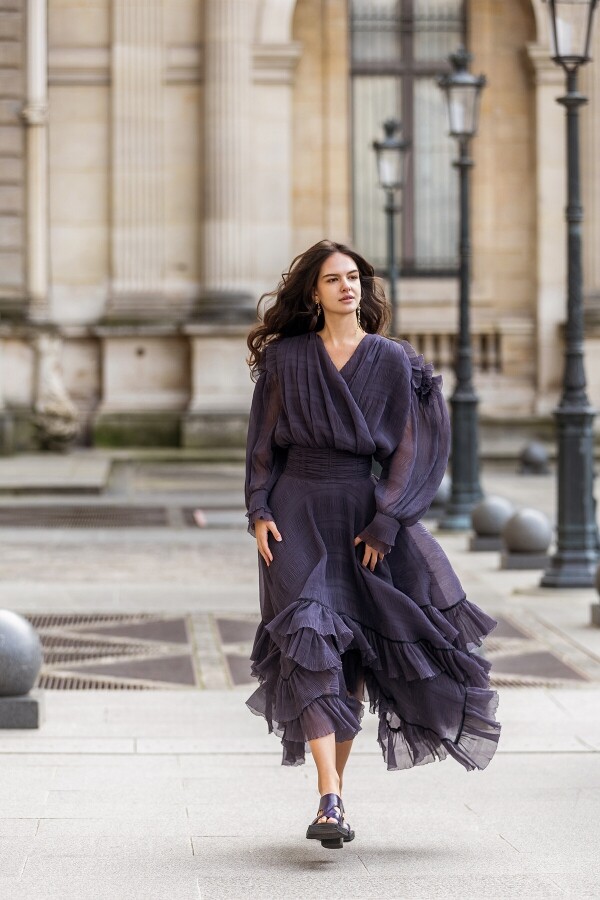 • 다크 그레이 컬러의 랩스타일 원피스 숄더 부분의 4단 프릴로 풍성한 볼륨감을 줌 어깨에서부터 허리라인까지 내려오는 내추럴한 드레이프 랩 스타일 2중 언밸런스 스커트 밑단 아래 러플 디테일