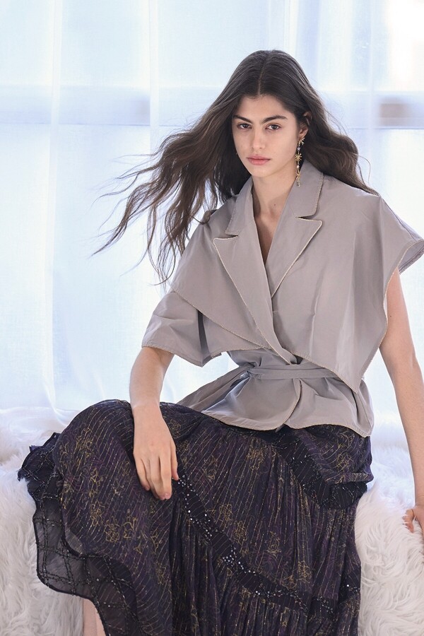 라이트 그린 컬러의 실크 자켓 암홀 아래 컷아웃 된 부분에 팔을 넣어 착용하는 케이프 디자인 고급스러운 광택감의 실크 소재 크롭 기장으로 롱레그라인 연출