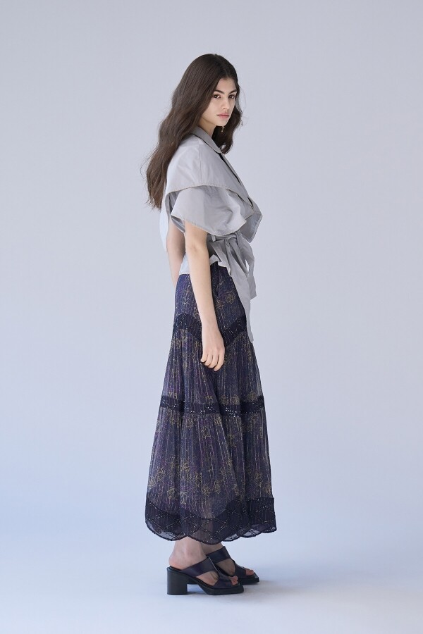 퍼플 네이비 컬러의 타이 블라우스 소매 절개 사이 블랙 레이스 장식과 파이핑 포인트