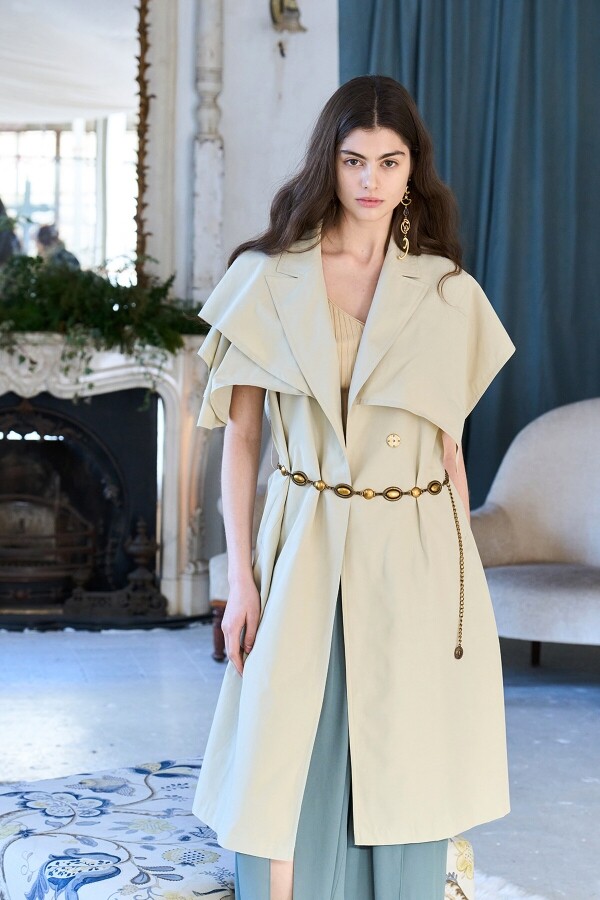 • 소이빈 컬러의 트렌치코트 언밸런스한 케이프 스타일 A라인 실루엣의 트렌치코트