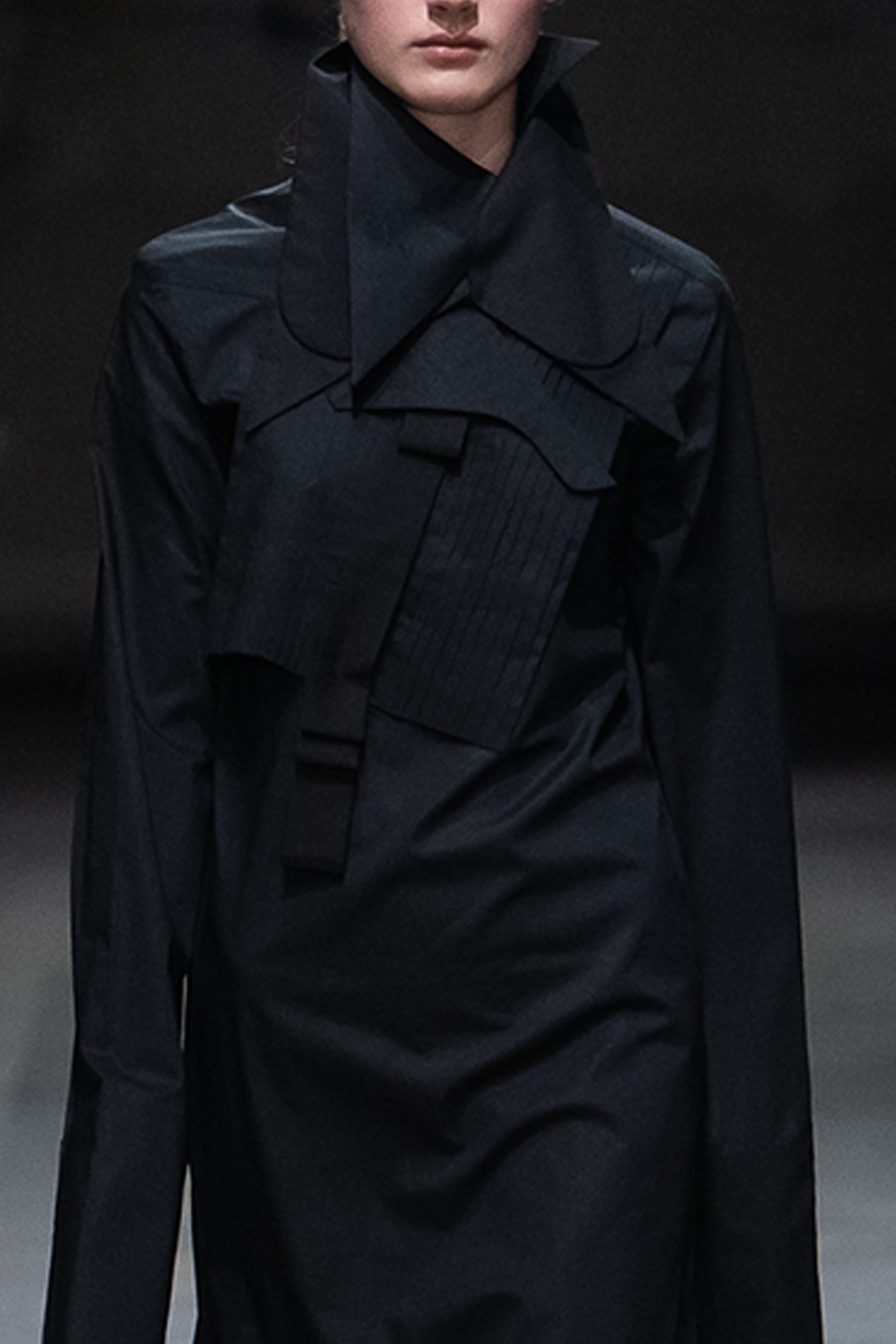 칼라, 앞여밈, 커프스, 소매 주름, 밑 단 등의 매혹적인 커팅이 특징입니다.