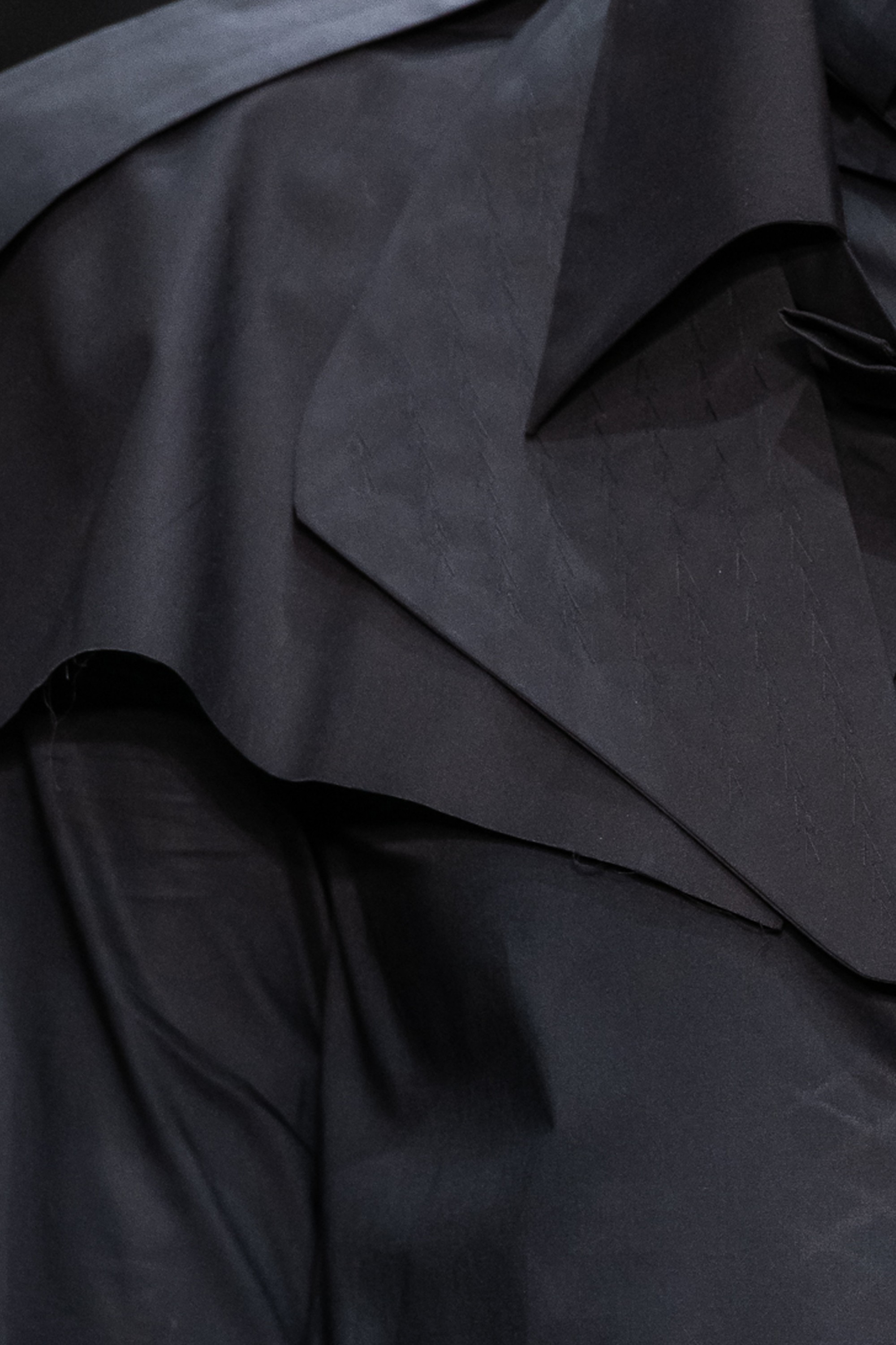 His designs exhibit visualized concepts, artisanal textiles, and structural silhouettes.