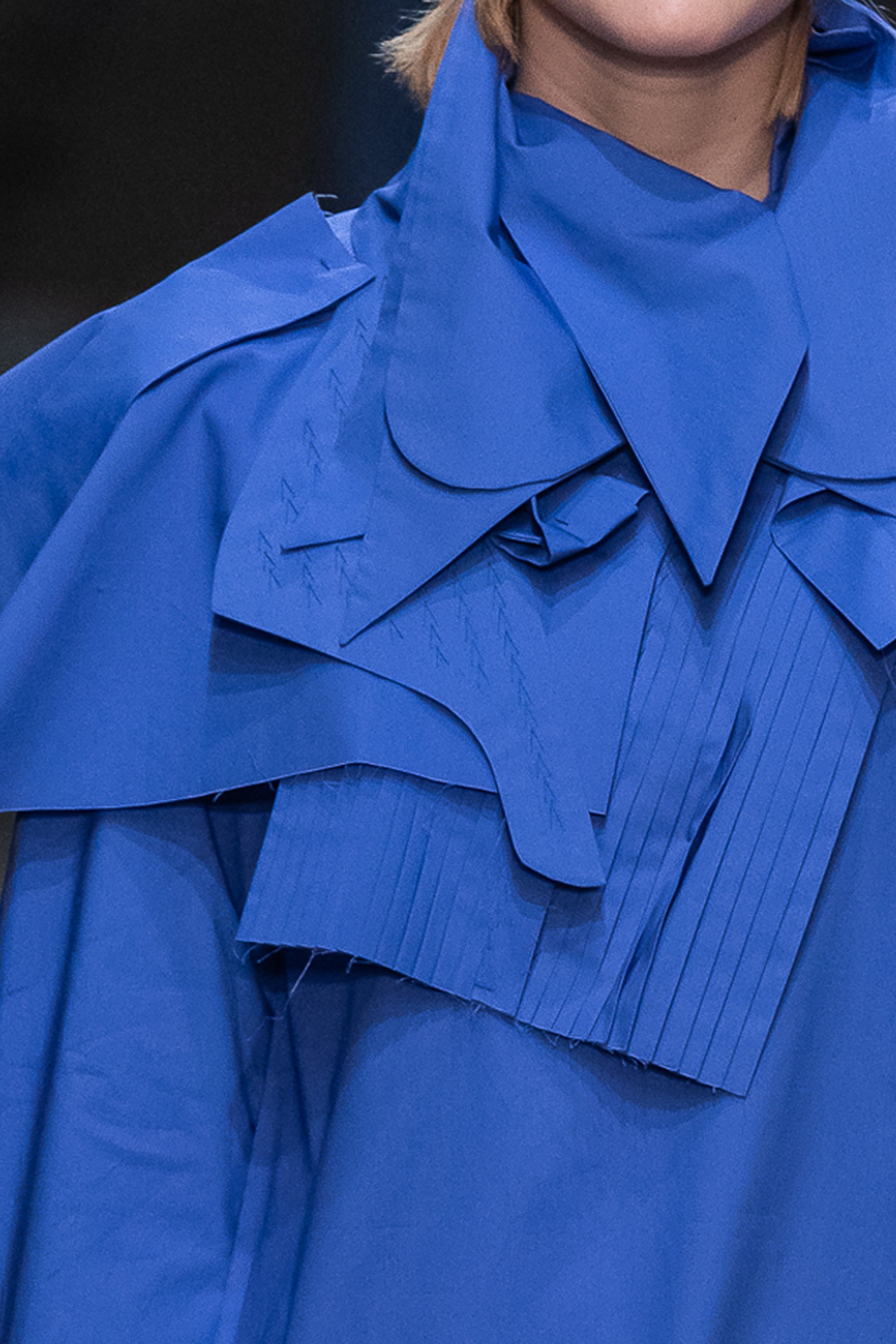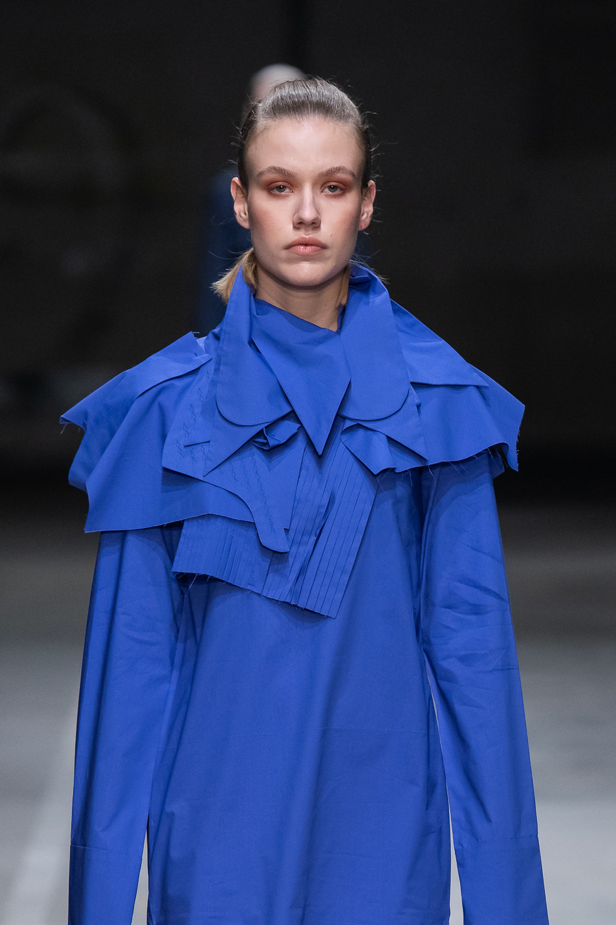 His designs exhibit visualized concepts, artisanal textiles, and structural silhouettes.