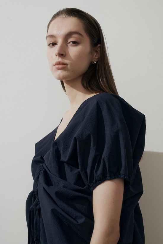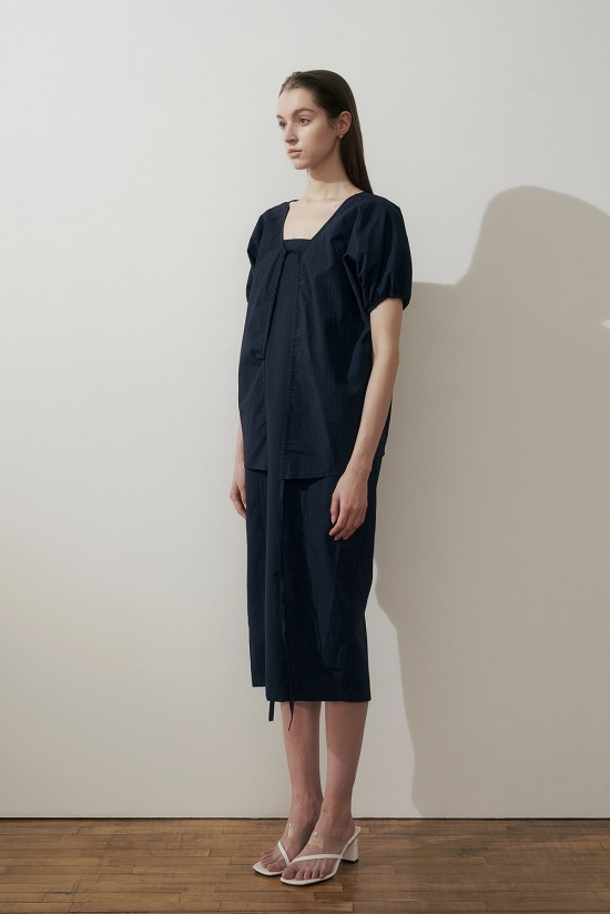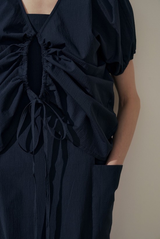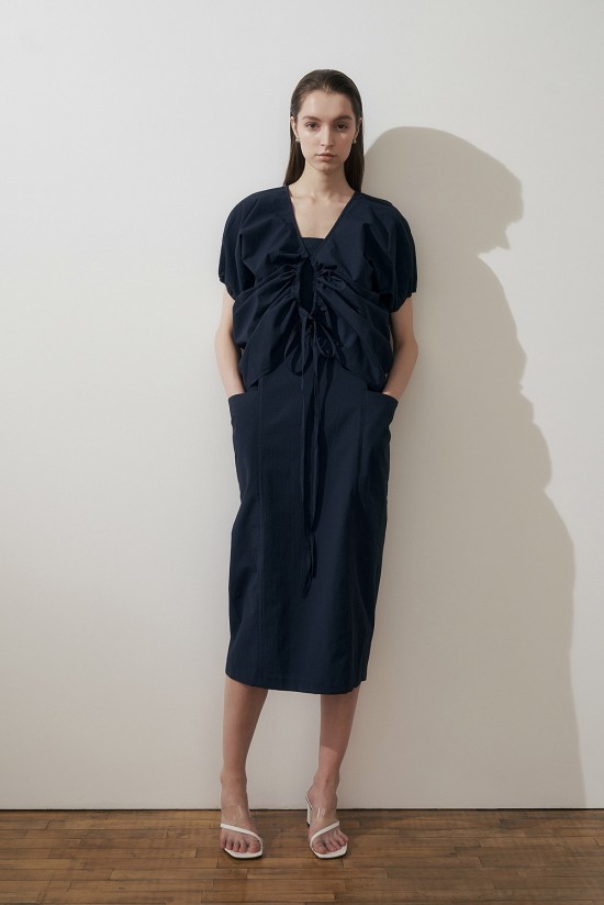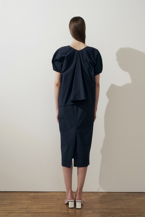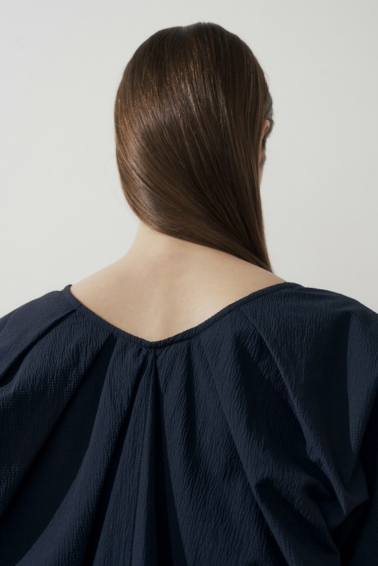 뒷쪽 핀턱 브이넥 라인이 우아한 분위기를 더해줍니다.