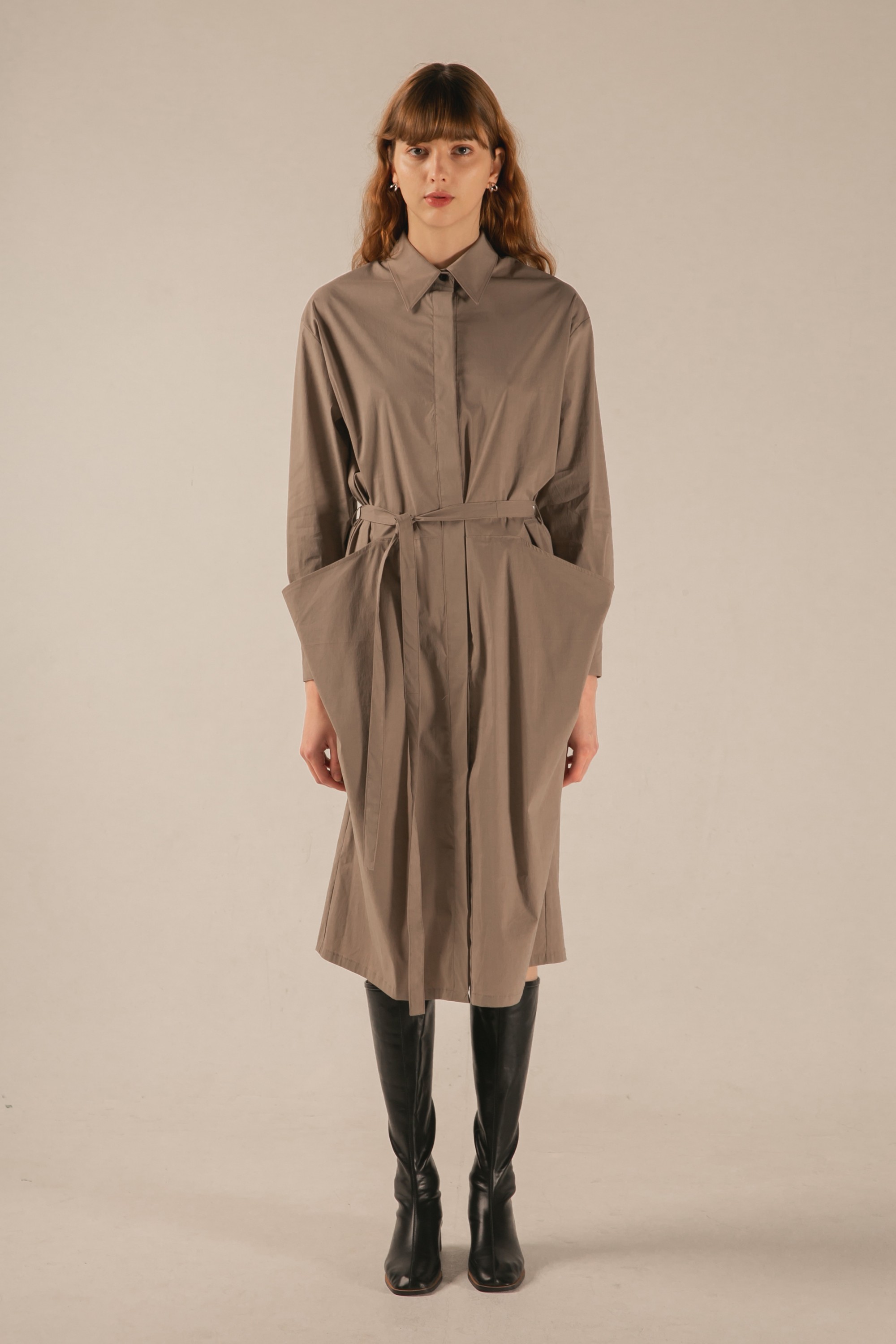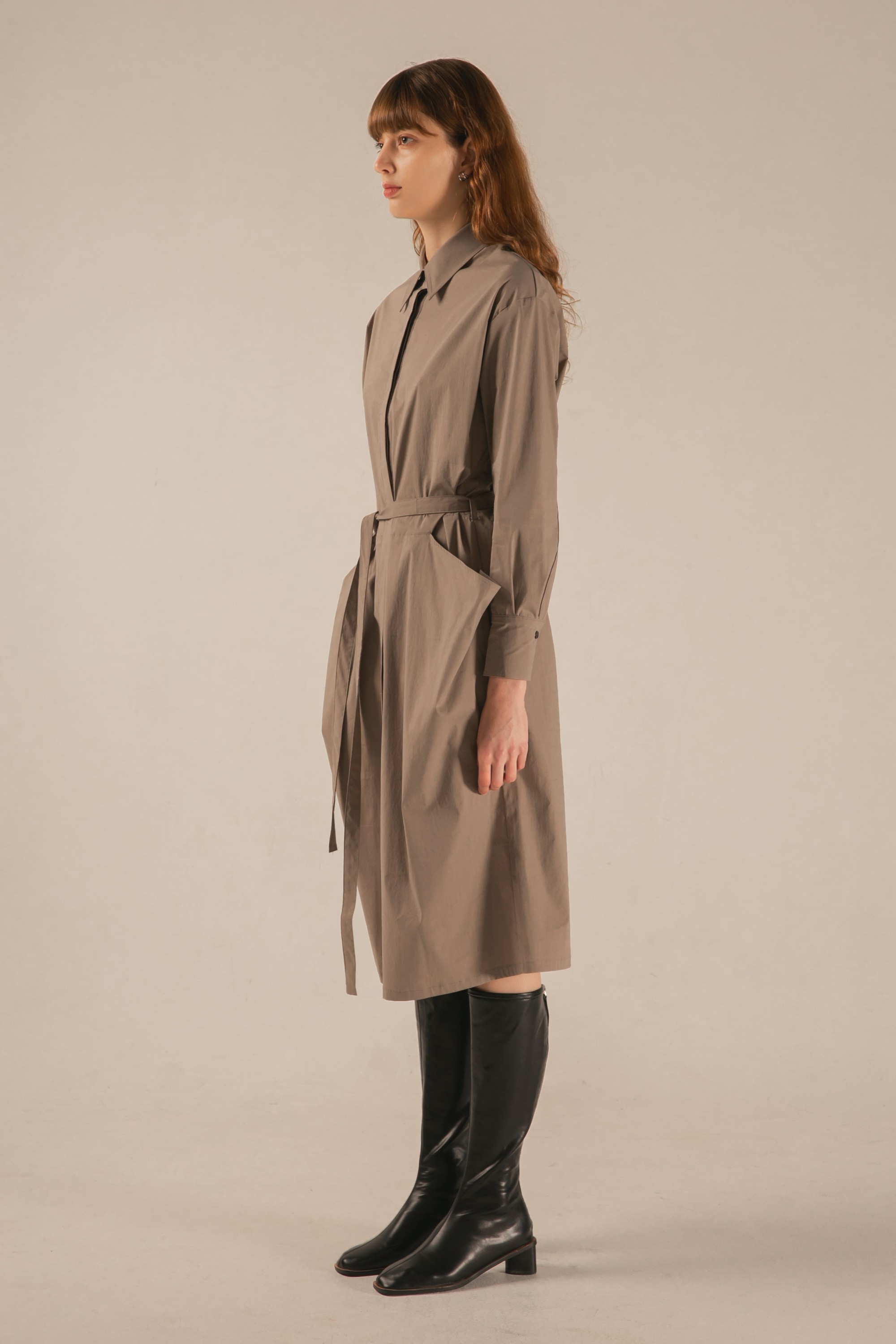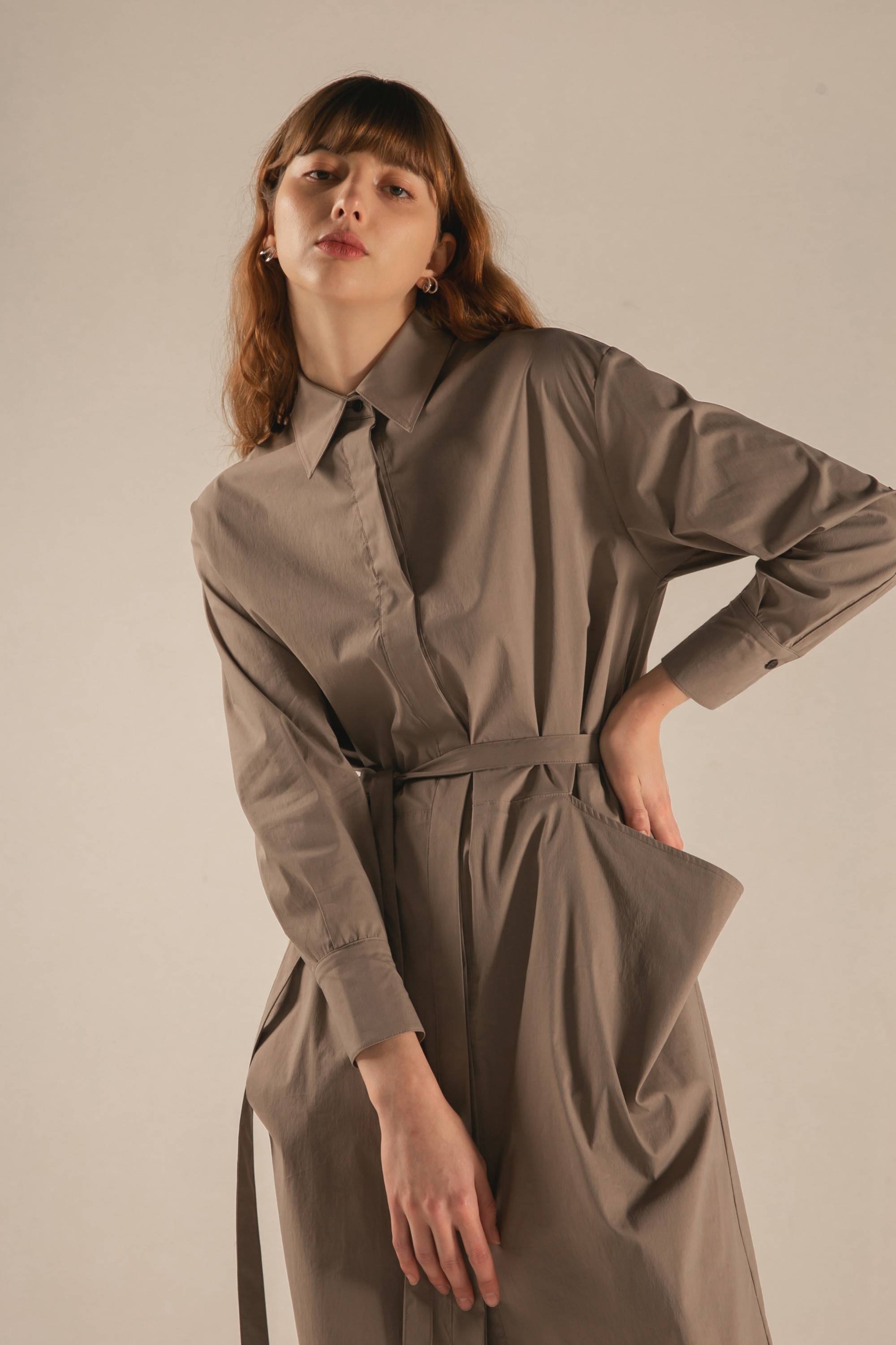 드레이프된 포켓라인이 우아한 무드를 연출하는 셔츠 드레스 입니다.