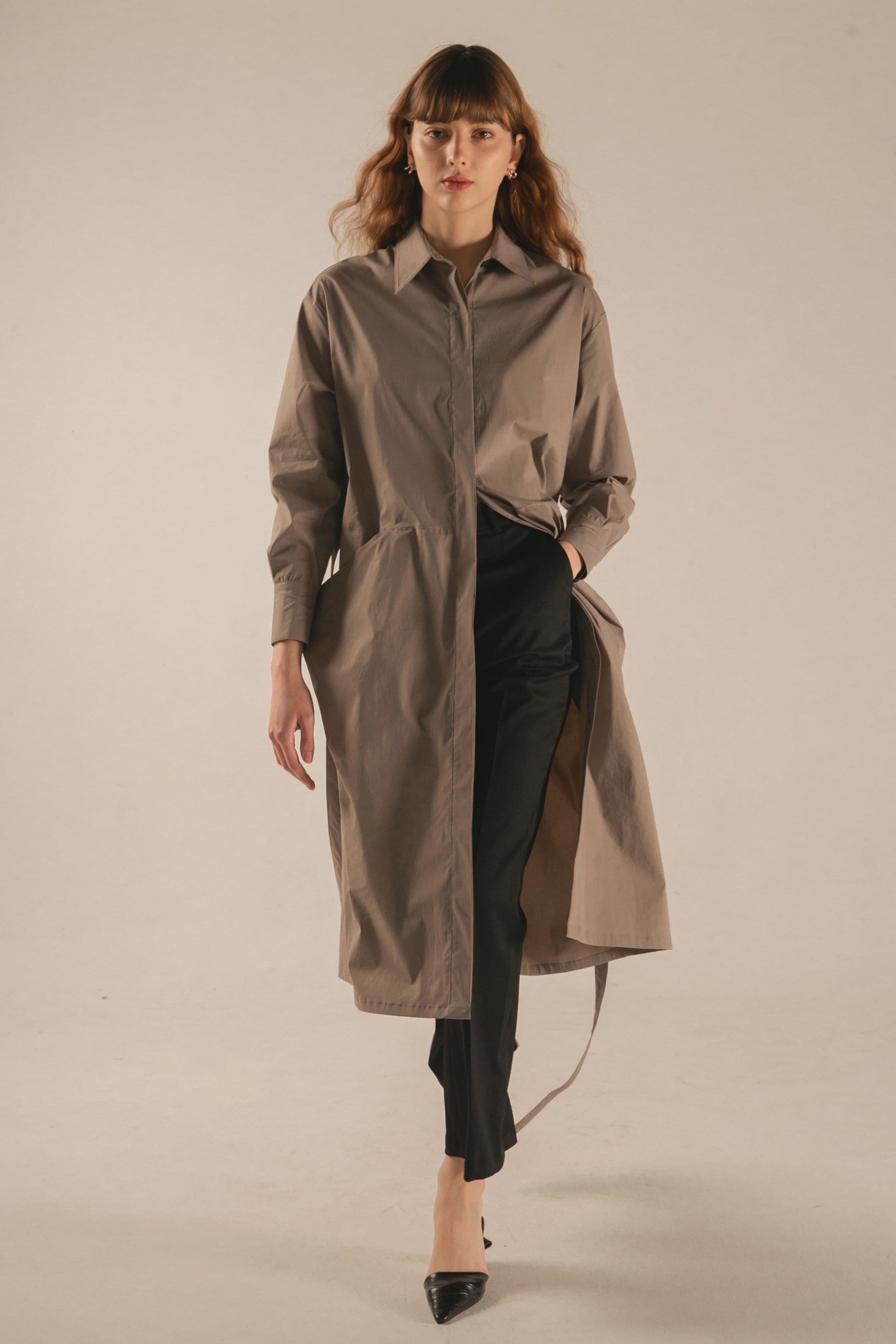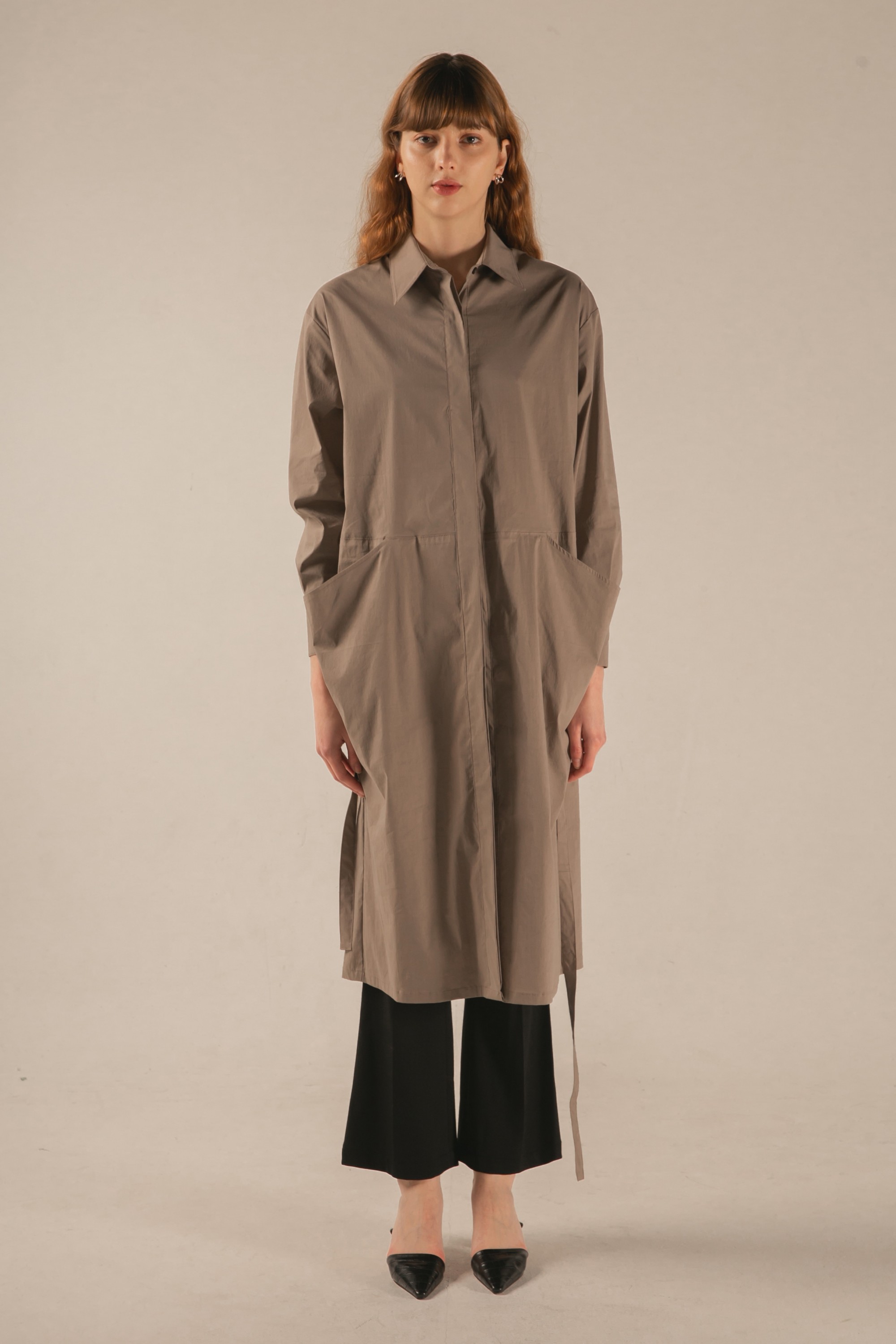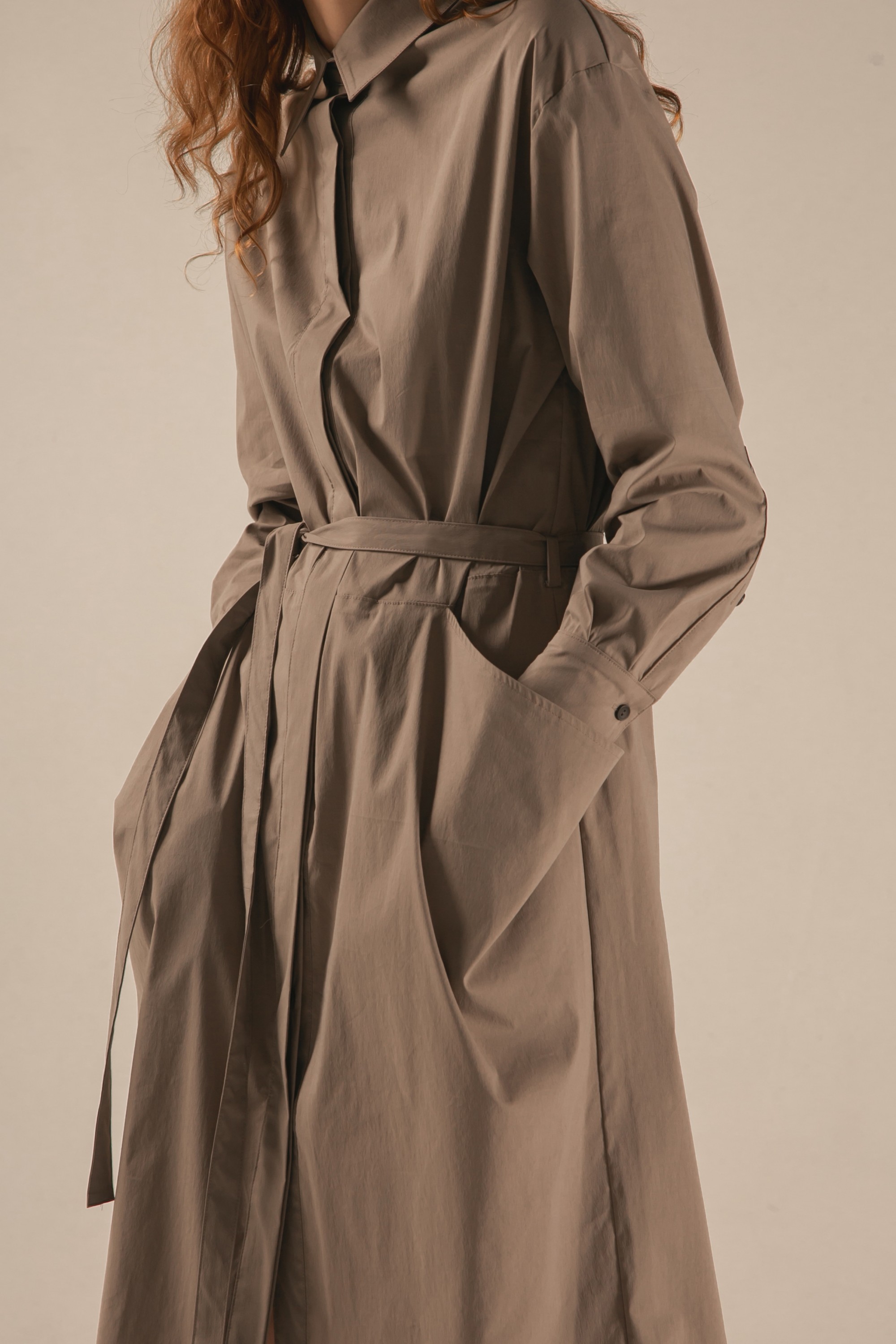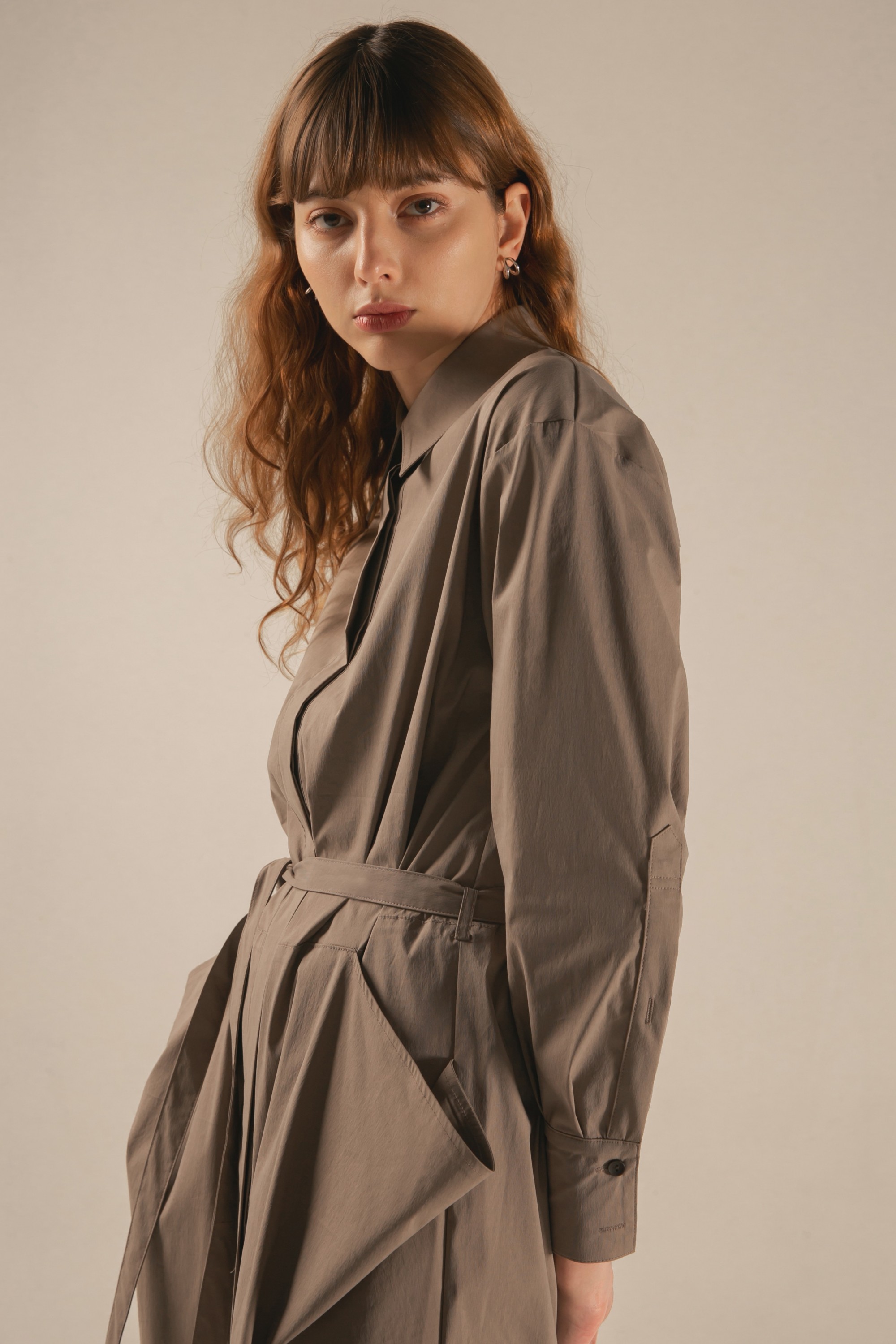 드레이프된 포켓라인이 우아한 무드를 연출하는 셔츠 드레스 입니다.
